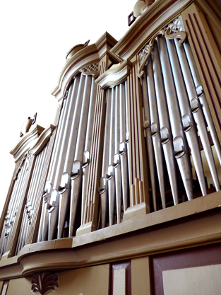Umgeben mit klassizistischen Schuckelementen sehen wir im Orgelprospekt 31 klingende Pfeifen, des insgesamt 10 Register umfassenden, einmanualigen Instruments.